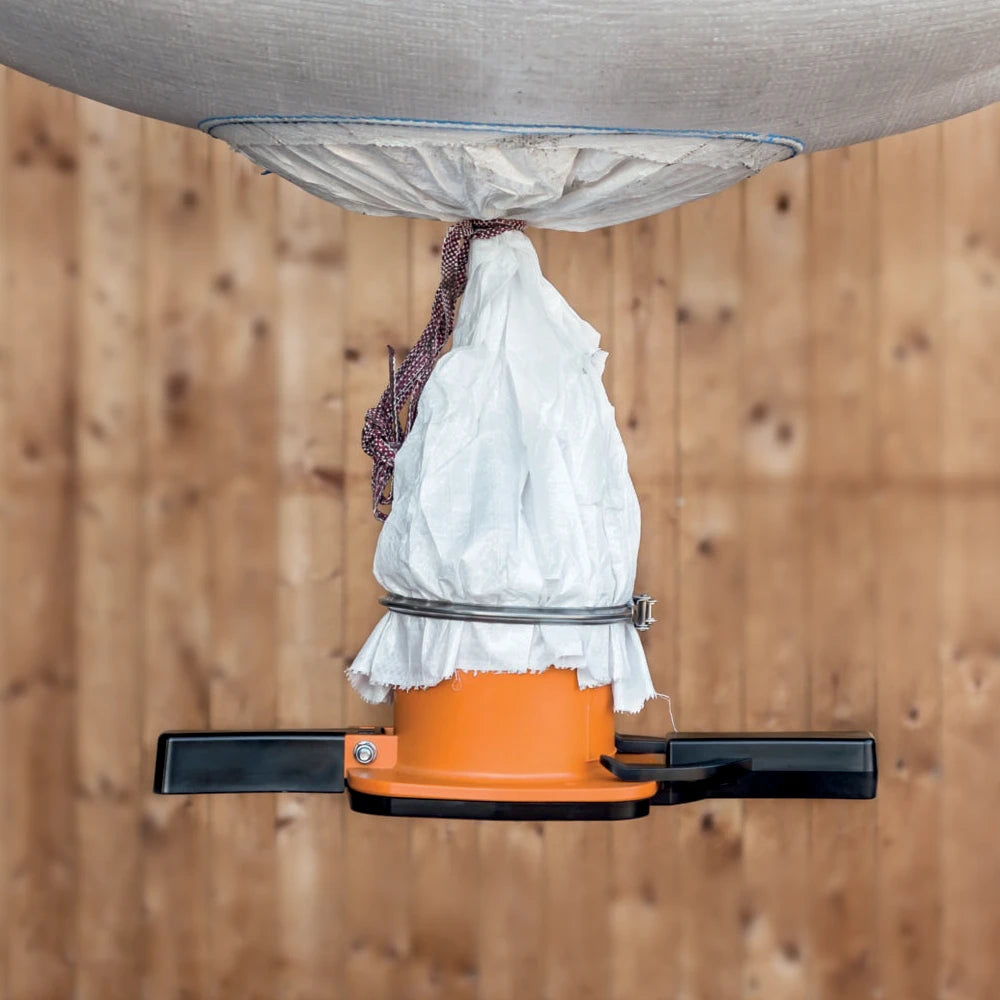 Pull down and fasten the tensioning ring with the discharge hose on the Fledbag® Easy