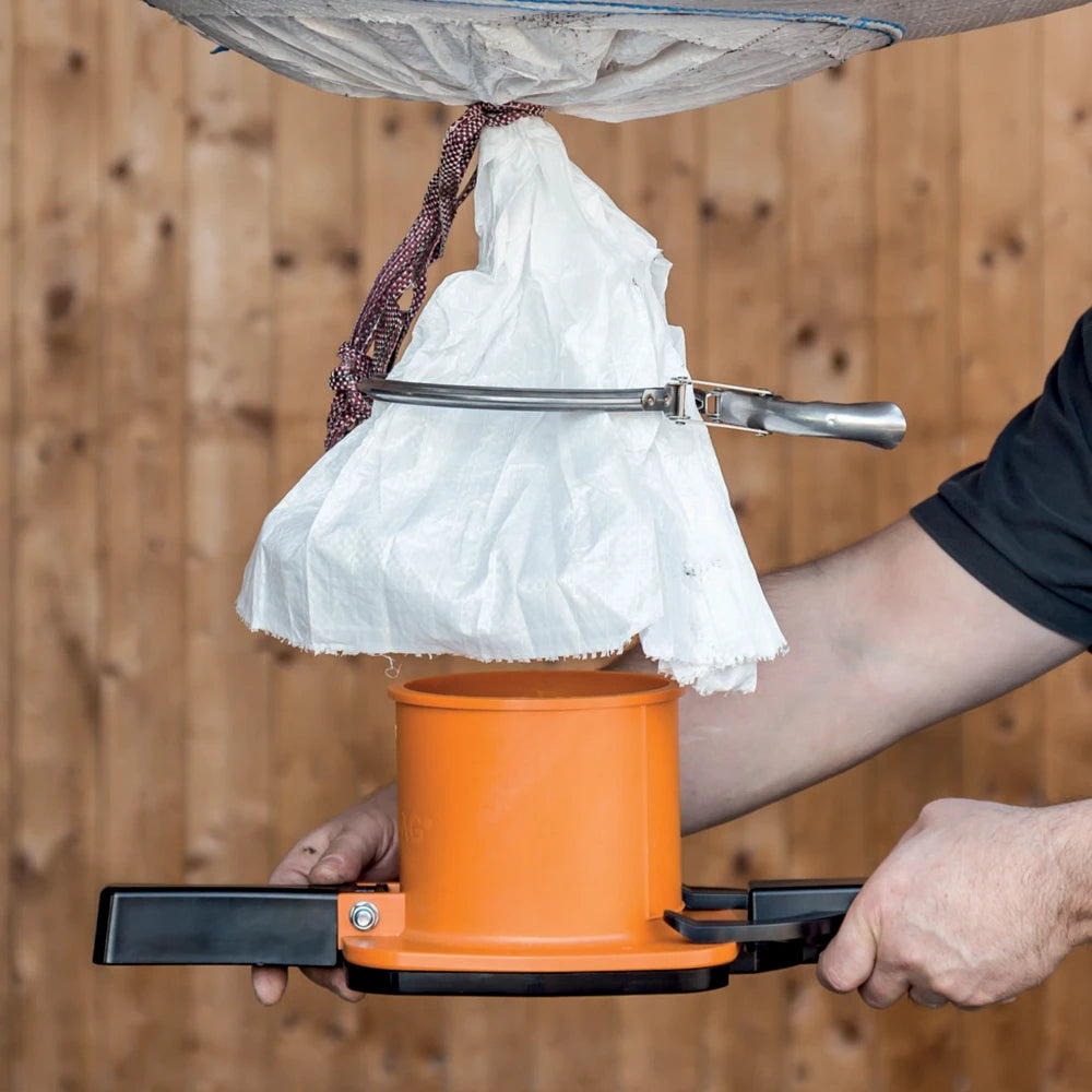 Fledbag® Easy: Attach the Fledbag® to the chute of your bulk bag using the tension ring, then fasten the discharge hose and the neck of the Fledbag® together. Open the knot on the bag outlet to allow the contents to flow into the Fledbag®. Use the handle to open the device and dispense as needed, then close it again to safely seal off the flow.